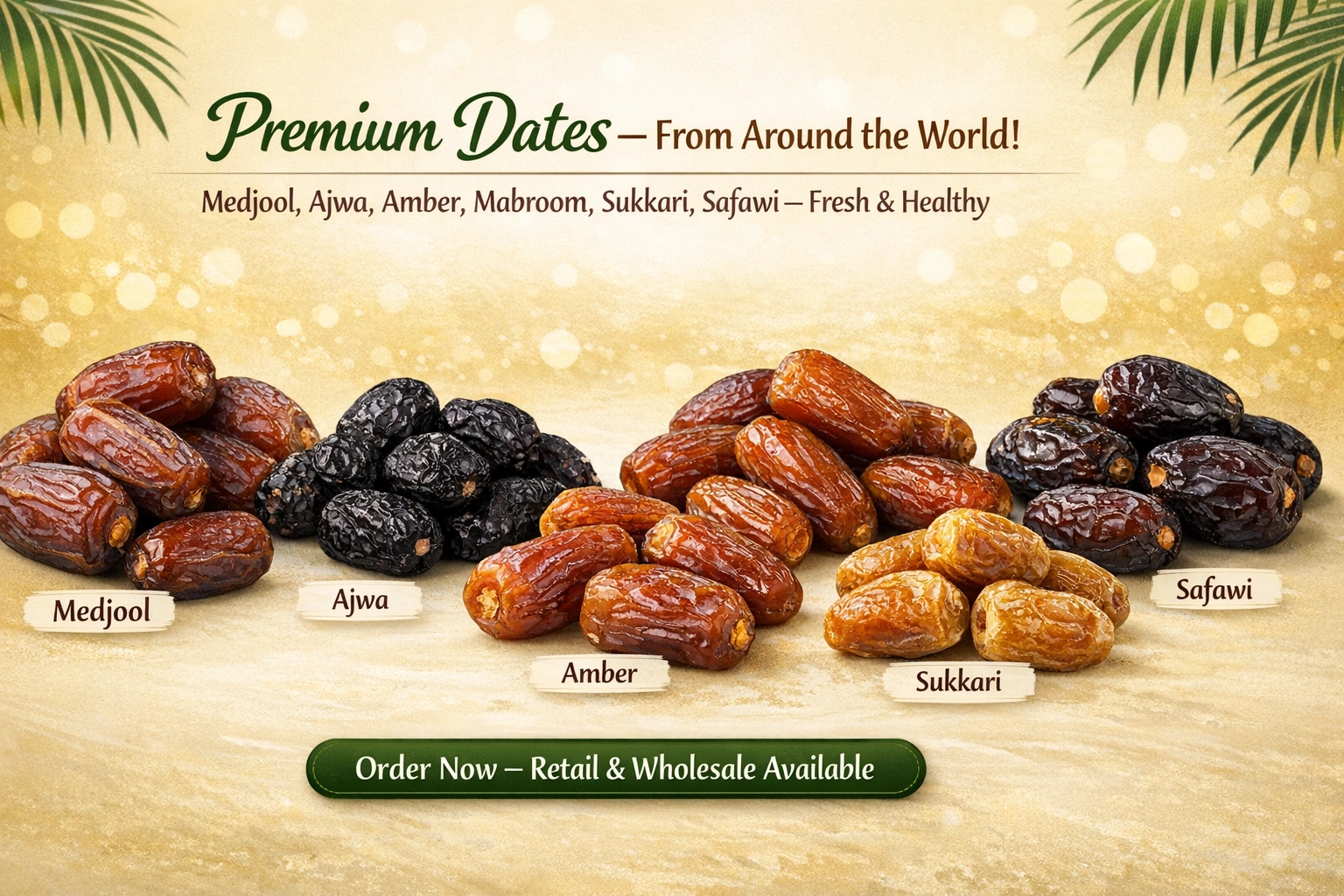 Premium dates are available for retail and bulk wholesale orders with a reliable supply and competitive prices.