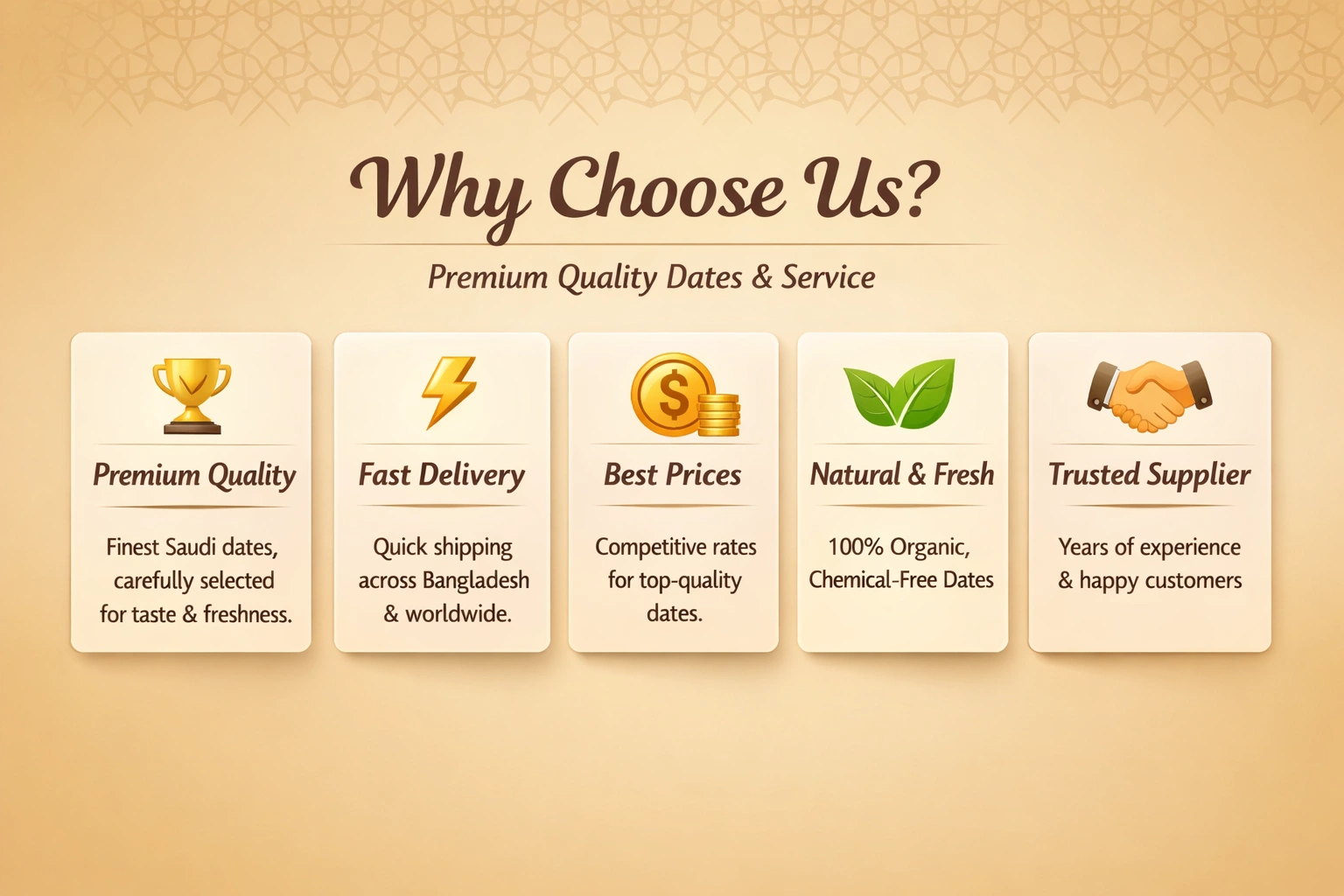 We import premium dates from Saudi Arabia, Algeria, Iran, Egypt, and Pakistan, ensuring freshness and authenticity